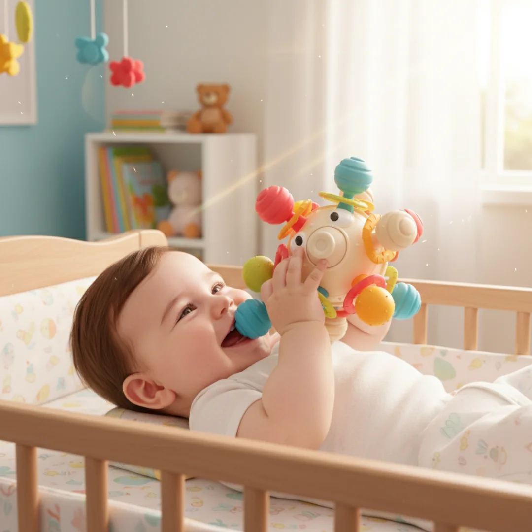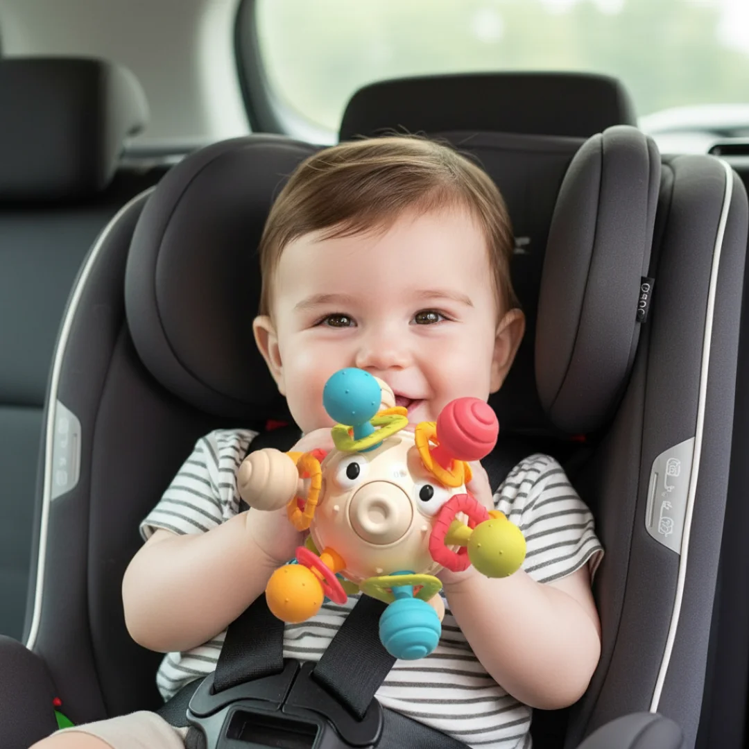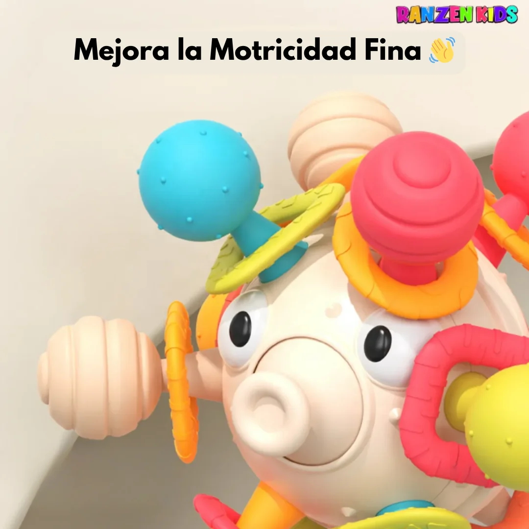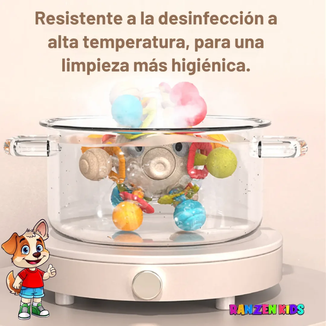 Tal vez la mayor ventaja de este juguete Montessori sea la exploración multisensorial que hará tu bebé mientras se esté divirtiendo. El desarrollo táctil es lo primero en lo que pensamos, pero… ¿Notaste los beneficios en la percepción auditiva gracias a su sonajero? ¿Y los puntos de mordida en goma blanda para los dientitos? ¿Qué tal el desarrollo de la motricidad fina mediante el juego con la goma flexible y el movimiento articulado?